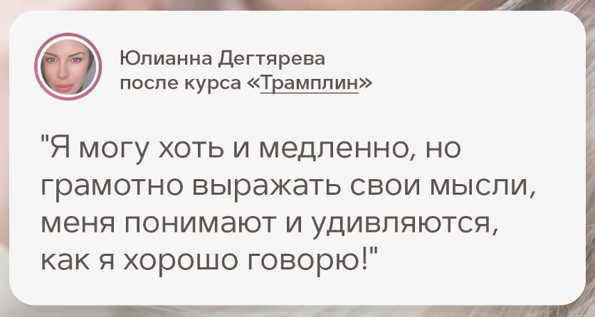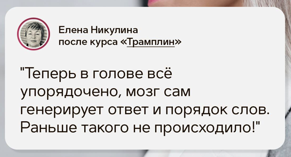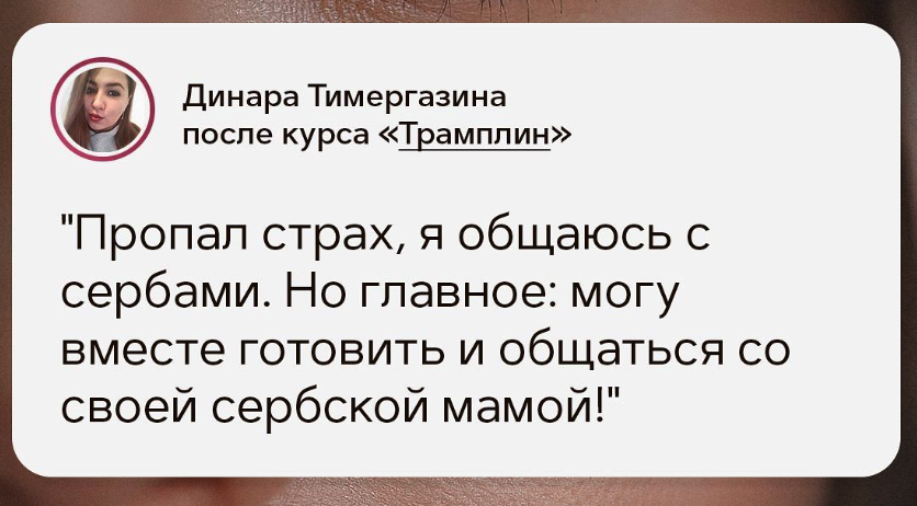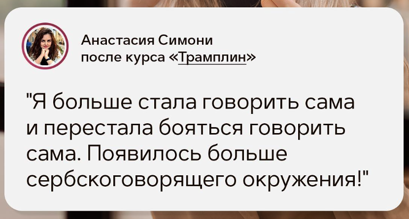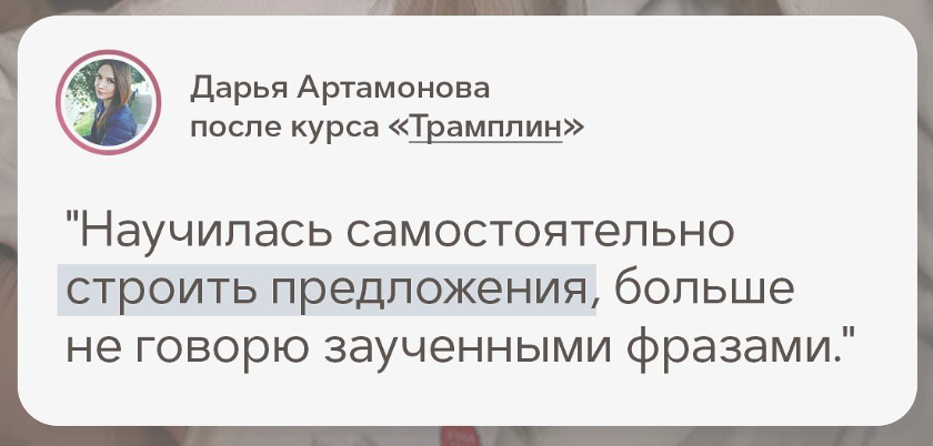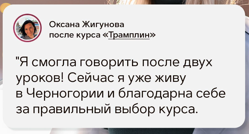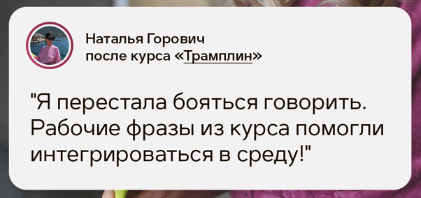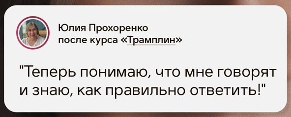 Ориентируюсь в языке, понимаю, что происходит, почему так говорят, понятна логика, появилась уверенность. Однозначно порекомендую курс «Трамплин». Конечно, всё в руках ученика, но с Трамплином усилия идут точно в цель: на изучение языка, а не на поиск материалов, не на поиск ответов на вопросы, не на выстраивание последовательности занятий.