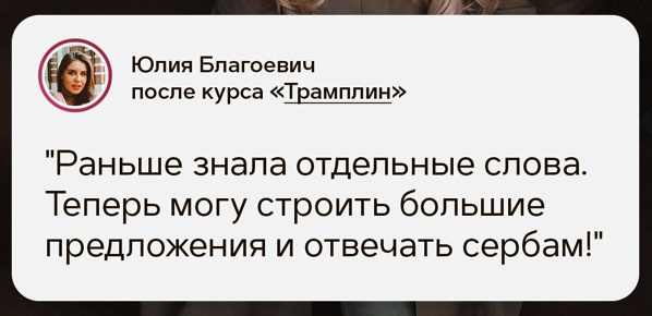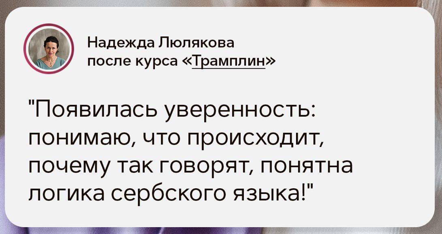 1. Очень чётко и понятно выстроена логика изложения материала. Уже три года у меня лежат два самоучителя по сербскому, и только после «Трамплина», я начала в них разбираться. До этого это был просто тёмный лес.